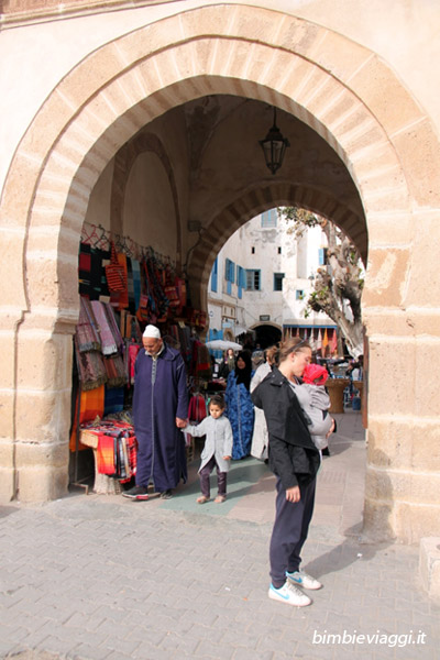 Noi non viaggiamo mai col passeggino, avevamo fascia e marsupio ergonomico, ottimi alleati per girare nelle strette strade delle cittadine marocchine.