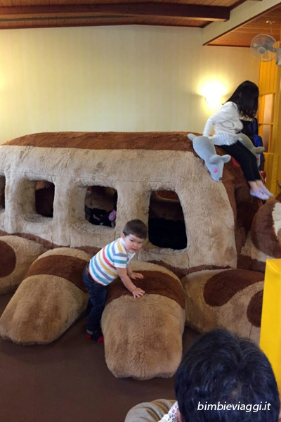 All’interno ci sono tutti i personaggi (Totoro, Kiki, Ponyo, Arrietty, … ) e per ogni anime sono stati messi in mostra i disegni che hanno dato vita a tutti i protagonisti con un unico filo conduttore: la creatività. La stessa creatività, racchiusa in questi cartoni, è stata trasposta all’edificio e agli arredi che lo compongono, trasformandolo in qualcosa di magico agli occhi dei piccolini. Il momento Top è stato il gattobus di Totoro in scala 1:1, in cui i bambini a turno e in piccoli gruppi possono entrare e tuffarsi, ovviamente sempre in modo morigerato. Noi eravamo commossi, Simone all’inizio un po’ titubante poi ovviamente non voleva più andarsene.