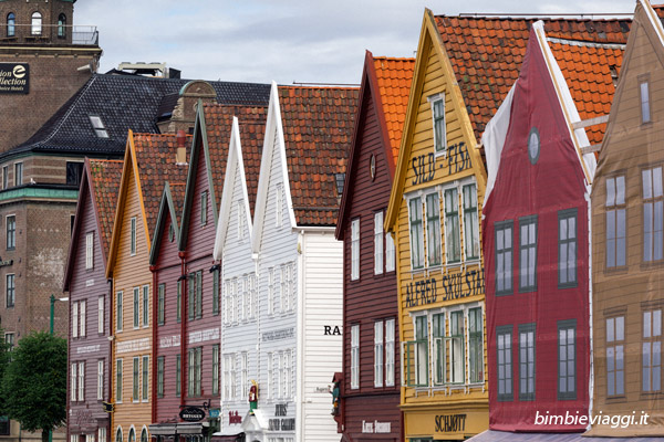 Con noi Bergen smentisce la sua fama di città più piovosa della Norvegia: ci accoglie con un bel sole che ci spinge persino a toglierci la felpa! La zona del porto è bella per passeggiare e immergersi un po’ nella civiltà. Rimaniamo un po’ delusi dal mercato del pesce di Torget che è costituito da un insieme di bancarelle per lo più gestite da italiani o spagnoli. Ci consoliamo comunque acquistando abbondanti e buonissimi panini al salmone, che consumiamo seduti su una panchina nel parco della fortezza guardando le barche nel porto. Anche la passeggiata nella zona di Brygge ci piace molto: tra i vecchi magazzini si insinua un dedalo di stradine strette che passano accanto a case sbilenche e vecchi magazzini.