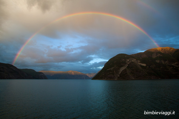 Siamo arrivati a Gudvanger poco prima delle 18 con l’idea di comprare i biglietti per il traghetto delle 9 della mattina, ma al ticket office ci hanno comunicato che il giorno successivo sarebbe iniziata la bassa stagione (era il 22 agosto!) e quindi il primo traghetto sarebbe salpato alle 12, non più alle 9. Presi alla sprovvista decidiamo di salire al volo sul traghetto delle 18 e ci ritroviamo a navigare attraverso un fiordo strettissimo, dalle pareti altissime. A tratti spioviggina, a tratti piove e non fa particolarmente caldo, ma tiriamo su i cappucci delle giacche e rimaniamo tutti e 4 sul ponte, incantati dalla meraviglia che la natura ci sta regalando. A un certo punto ci sentiamo un po’ genitori snaturati e portiamo i bimbi sotto coperta e guardiamo il panorama dai finestroni, ma non è per niente la stessa cosa! Dopo poco siamo di nuovo tutti sul ponte della nave a bocca aperta e naso all’insù. Man mano che il fiordo si allarga il cielo si fa meno grigio e smette di piovere. Poco prima di arrivare a Kaupanger appare l’arcobaleno più vivido che abbiamo mai visto e quasi ci commuoviamo davanti a questo spettacolo!