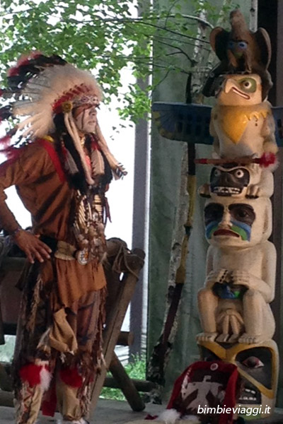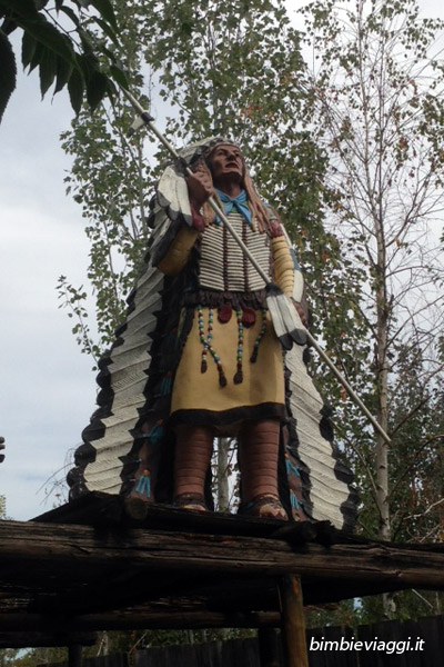 Qui, oltre ad essere stato ricreato un piccolo accampamento indiano, c’è un palcoscenico con gradinate su cui sedersi per poter vedere la messa in scena della storia di un coraggioso indiano a caccia di una piuma di aquila, corredata da musiche, canti e danze. A noi lo spettacolo è piaciuto, belli i costumi e le musiche e Chicco è rimasto affascinato dal guerriero indiano che si è esibito con arco e frecce.