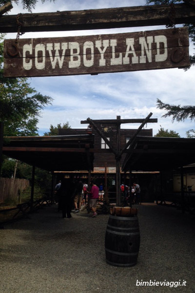 Entriamo e l’emozione fa brillare gli occhi del cucciolo, che inizia ad avvistare segni di Far West: all’ingresso svetta una grande scritta Cowboyland ed al botteghino, dove facciamo una brevissima e rapida coda, ci accolgono ragazzi e ragazze vestiti da cowboy. Consegniamo il coupon, ci mettono un braccialetto che servirà per entrare ed uscire dal parco durante la giornata, ci consegnano un buono per 1 giro sul pony e finalmente entriamo.
