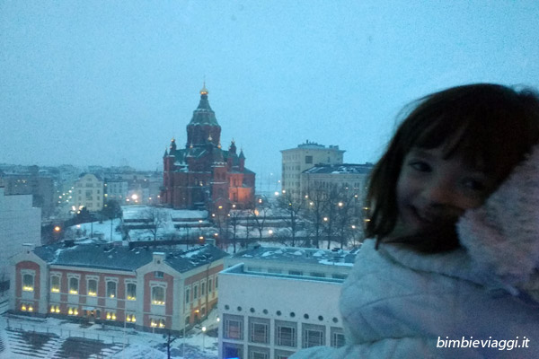 Fa molto freddo, Rebecca è stanca (e infatti si addormenta sulle spalle), quindi decidiamo di non percorrere la scalinata ed entrare nell’edificio, ma piano piano ritorniamo in hotel. Facciamo una doccia e ci riscaldiamo per bene, e decidiamo di rimanere a mangiare nel ristorante dell’hotel, senza dover riuscire ancora per andare a cercare un posto dove mangiare. La scelta è ottima: circa 50 euro per 2 abbondanti piatti unici e un menu bambino più bevande (anche in questo caso, prezzo più che onesto visti gli standard di Helsinki!). Vorremmo uscire a bere un caffè o cappuccino con dolce da Starbucks o altri locali, ma scopriamo che sono già tutti chiusi! Quindi rimaniamo nell’area giochi dell’hotel per un po’ e poi ci ritiriamo nei nostri appartamenti, pronti per il nostro ultimo giorno!