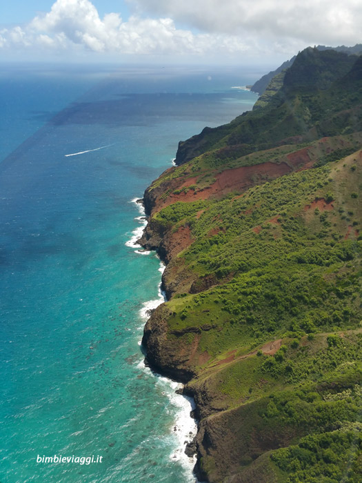 Siamo entrati in un antico cratere, anche questo interamente verde, per poi uscirne e sbucare sul mare, proprio davanti alla Na Pali Coast… con queste rocce verdi a picco sul mare, a creare giochi di colore e di ombre di una bellezza magnetica.