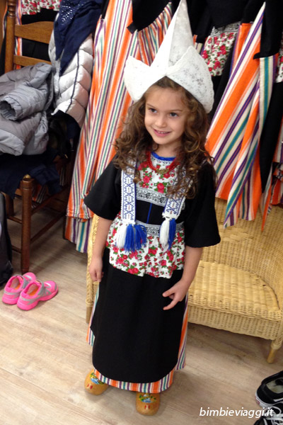 - Infine ecco il ” the best ” della nostra Bea che adora più di qualsiasi cosa travestirsi, interpretare e calarsi nei personaggi. Conoscendola e sapendo che sarebbe impazzita dalla gioia le avevamo organizzato una sorpresa: un servizio fotografico in costume tipico: a Volendam, infatti, più che da altre parti viene mantenuta viva la tradizione del vestito tipico che viene ancora indossato dagli abitanti nei giorni festivi. Ci sono parecchi negozi che lo offrono, più o meno i prezzi sono gli stessi; io dopo una ricerca in rete ho optato per lo storico Foto de Boer, 15 euro per una persona , servizio comprensivo di 2 stampe piccole o una grande e possibilità di prenotare on line l’orario. Così, dopo aver indossato zoccoletti di legno, cuffia bianca a punta al centro in pizzo, camicia bianca e corpetto nero, gonna a righe colorate e collana di corallo, la nostra nana ha potuto avere il suo quarto d ora di gioia e divertimento. Mentre aspettavamo il nostro turno abbiamo visto intere famiglie farsi fotografare, un’ idea molto originale oltre che un bellissimo ricordo.