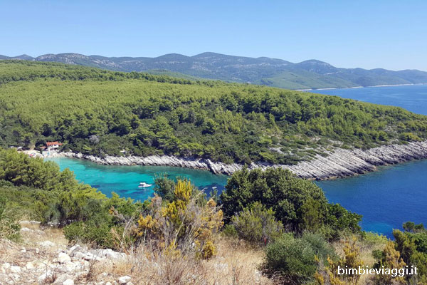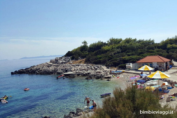 La prima spiaggia assolutamente da non perdere è la baietta di Zitna, vicino al paesino di Zavalatica. In assoluto la nostra spiaggia preferita. Qui i boschi riflessi nell’acqua e i sassi bianchi fanno assumere al mare un colore verde particolarissimo, che potrete riconoscere già dall’alto. La spiaggia è piccolina, quindi consigliamo di arrivare la mattina sul presto se volete trovare un angolo tranquillo, e si raggiunge solo a piedi con una passeggiata di circa 10 minuti poco impegnativa. Il mare è pulitissimo e ricco di pesci per gli amanti dello snorkeling. Davide (con l’aiuto del papà) è addirittura riuscito a pescare un polpo col retino a riva… la spiaggia non è attrezzata e c’è solo un piccolo foodtruck che vende bibite e panini.