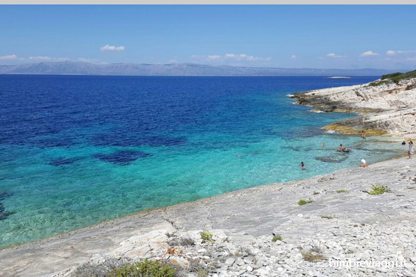 E infine, non perdetevi una gita all’isoletta di Proizd (dedicatevi una giornata intera). Le barche per l’isola partono ogni ora dal porto di Vela Luka e una traversata di circa 20 minuti vi porterà in questa isola verdissima. Dal porticciolo diversi sentieri vi porteranno in diverse spiagge e calette, una più bella dell’altra. I sentieri, che passano in mezzo ai boschi, sono molto piacevoli e offrono una bella frescura. Appena sbarcati non vi resta quindi che da guardare la mappa e cercare la spiaggia che più vi aggrada. Noi abbiamo cercato una spiaggia di ciottoli che fosse facilmente raggiungibile da Davide e dove i bimbi potessero entrate facilmente in acqua, anche se le baiette più spettacolari sono forse quelle di scogli… Posso dire che in tutto il mediterraneo non ho mai visto un mare con questi colori?