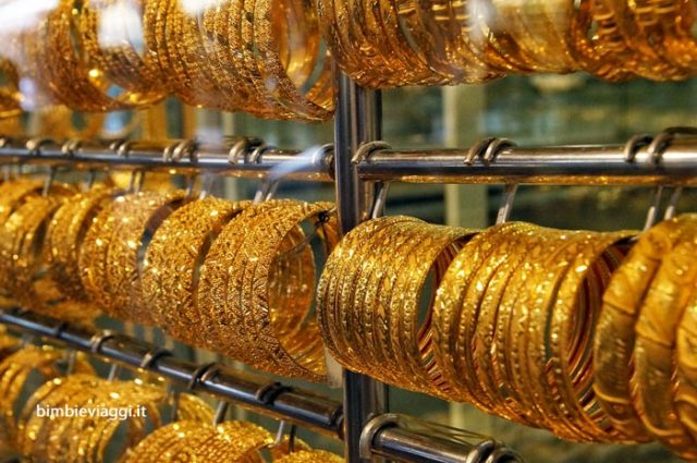 Noi siamo arrivati in metropolitana a DEIRA (metro verde, fermata Al Ras, biglietto circa 2 euro a testa) e, in 10 minuti a piedi, abbiamo raggiunto la zona dei souq, cioè degli antichi mercati dell’oro e delle spezie. Il souq dell’oro è quello che ci ha colpiti maggiormente: una sorta di mercato coperto, con diverse decine di negozietti che vendono oro in tutte le forme e quantità, con alcuni pezzi decisamente vistosi (addirittura un vestito/gioiello da 1 milione di euro!) e fotografatissimi soprattutto dai giapponesi!