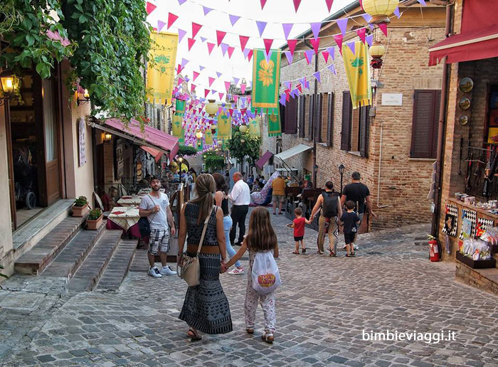Le stradine del borgo sono percorribili anche con passeggini e carrozzine. Si tratta però di strade acciottolate e la principale è in forte pendenza, quindi serve sicuramente un po’ di forza per spingere (e per trattenere i passeggini in discesa) e sicuramente con le ruote grandi si procede più agevolmente.