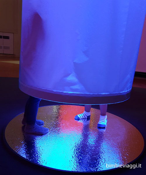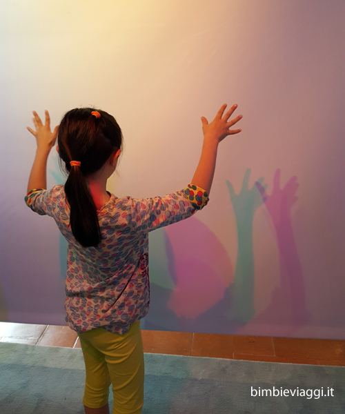 Entriamo in una scatola tutta bianca e illuminata dove, grazie alle bravissime guide del museo, iniziamo a sperimentare ombre e luci, prima coi nostri corpi e poi con gli oggetti.