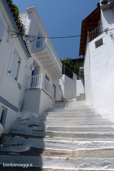 Il paese di Skopelos è carino, tipico paesino greco tutto bianco; noi abbiamo dormito nella parte vecchia in una casa molto bella e tipica prenotata tramite airbnb.com; sul porto ci sono molti locali abbastanza turistici, ma tutto nei limiti.