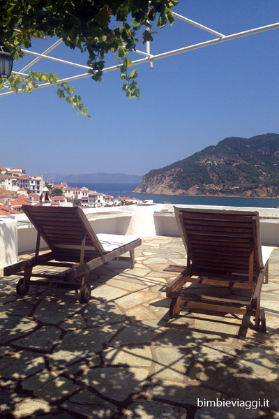 Per l’alloggio, noi siamo stati a Kolios, presso Albanis Villas, ma non lo consiglio (posizione non bella e appartamenti nuovi ma proprio troppo cari rispetto a quanto offrono, compresa aria condizionata come optional da pagare giornalmente!). Vi consiglio però un ristorante fantastico, il Skiathos Olive Land Restaurant, che si trova in una posizione difficilissima da raggiungere in cima ad una collina al fondo di una strada minuscola ma ha una vista stupenda sull’isola e sul mare e vale davvero la cena anche con i bambini che possono muoversi nel ristorante senza alcun problema (andate a vedere il bagno).