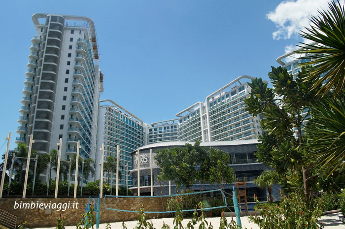 Atterrando a Manila la sera tardi, la nostra priorità è stata trovare un alloggio comodo, non distante dall’aeroporto. Dopo qualche ricerca, abbiamo trovato una sistemazione in zona Paranaque, a circa 20-60 minuti dall’aeroporto (a seconda del traffico): un mini appartamentino con 2 camere matrimoniali, salotto con angolo cottura e divano letto, situato all’interno di un complesso residenziale che si chiama Azure Urban Resort, di cui fa parte il Paris Beach Club (Paris Hilton per la cronaca) con tanto di grande piscina con le onde, bar e ristorante. L’appartamento in sé era decisamente piccolo e con servizi basic, senza neanche lo spazio per sistemare le valigie in stanza, ma perfetto per una notte in attesa di “altri lidi”, visto il prezzo (60 euro a notte in 6) e i servizi del resort.
