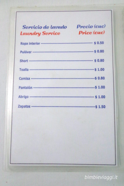 Oltre alle scarpe da ginnastica indossate durante il viaggio, abbiamo portato solo le ciabatte (io ho portato anche un paio di sandali, usati una volta per non dire che li avevo presi per niente), shorts, qualche abitino o canotta leggeri, pantaloni lunghi indossati solo durante il viaggio e a cavallo, magliette e intimo che qualche volta ho lavato. In alcune case forniscono anche il servizio di lavaggio indumenti per pochi cuc. Per noi è stato un servizio particolarmente comodo a Vinales, quando, dopo la mattinata a cavallo, ci siamo trovati infangati fino alle orecchie e quindi abbiamo chiesto alla casa di lavarci non solo gli abiti ma anche le scarpe (che sono tornate splendenti).