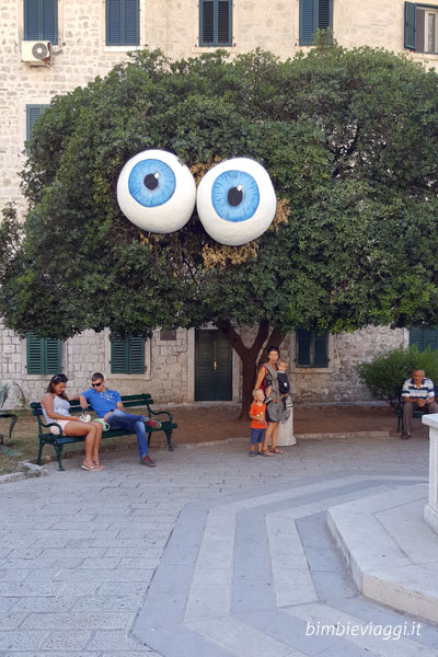 La seconda tappa è stato il Paese di Kotor (o Cattaro), secondo me il borgo più bello che abbia visitato in Montenegro. Vi consiglio di visitarlo con calma, perdendovi tra i vialetti di pietra bianchissima e, se avete gambe buone, percorrendo tutte le mura di difesa che si inerpicano sulla montagna. In quel periodo Kotor stava ospitando un festival d’arte e le strade erano piene di installazioni artistiche molto affascinanti e che hanno divertito anche i bambini: panche e sedie giganti (su cui i bimbi potevano salire), gabbiani enormi appesi nei vicoli che muovevano le ali col vento, alberi con gli occhi. E infine, una bambola gigante (e intendo proprio gigante!) seduta sulle mura della città che ha terrorizzato Davide (che ancora adesso ogni tanto mi chiede della bambola gigante per assicurarsi che da Kotor non decida di farsi una passeggiata fino a Milano).