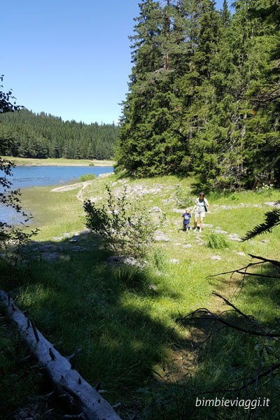 Il nostro treenne non è un grande amante delle camminate in montagna, quindi abbiamo optato per l’escursione al Lago Crno (in italiano, Lago Nero), il simbolo del parco nazionale di Durmitor, che ci è stata segnalata come una delle escursioni più semplici e adatte ai bambini. In effetti è un’escursione ideale per le famiglie. Dall’entrata del parco una semplice passeggiata in piano in mezzo al bosco di circa mezz’ora (a passo di bambino) ti conduce al lago. Il sentiero è asfaltato e può essere percorso anche col passeggino, e a metà strada si trova anche un bel parco giochi (elemento che ha rallentato ancora di più la nostra passeggiata…).
