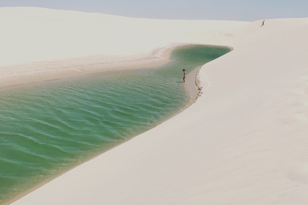 Nel pomeriggio siamo arrivati alle dune del Parco con un tragitto a dir poco incredibile: dopo un’enorme chiatta per attraversare il Rio Preguiças, sentieri di sabbia in mezzo alla foresta e poi loro: i grandi Lençóis Maranhenses, spettacolari anche con i piedi per terra. Passeggiate circondati da dune a perdita d’occhio, intervallate da lagune in cui non abbiamo mancato di tuffarci per riprendersi da caldo e stanchezza.