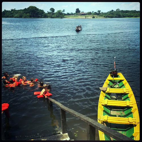 Mattina passata girovagando per Ilha das Canarias, accompagnati da Matteo, figlio quattordicenne dei proprietari della posada. Il villaggio non ha strade, ma solo sentieri di sabbia, la vita scorre lenta sempre lungo il fiume, nella piazzetta principale un gruppo di ragazzi pulisce una montagna di granchi per il pranzo, un gruppo di signori un po’ più attempati giocano a biliardo, molti dondolano sulle amache appese nelle logge fuori casa, chiacchierano e sorseggiano caffè. La scuola è aperta, si sentono le grida dei bambini.