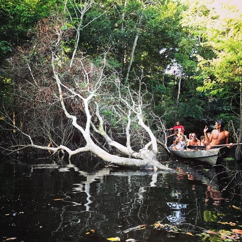 Per i seguenti 4 giorni, con le nostre barche in legno abbiamo esplorato la foresta in lungo e largo, facendoci anche spazio con le mani per scansare rami e liane dall’alto, ragni ovunque, ma abbiamo incontrato anche iguane, delfini rosa e una mamma bradipo col suo cucciolo.