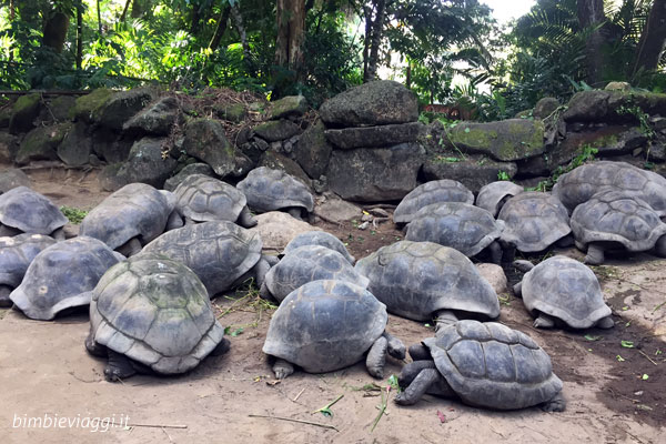 Il recinto con le tartarughe è grande e ci sono tantissimi esemplari. Per entrare al giardino botanico si paga un ingresso (mi pare di circa 100 rupie cioè 7 euro a testa bambini esclusi) e si paga un ulteriore biglietto per entrare nel recinto delle tartarughe (altre 50 rupie e in questo caso pagano anche i bambini). Qui incluso nel costo del biglietto viene data una grande foglia di banano per dar da mangiare alle tartarughe.