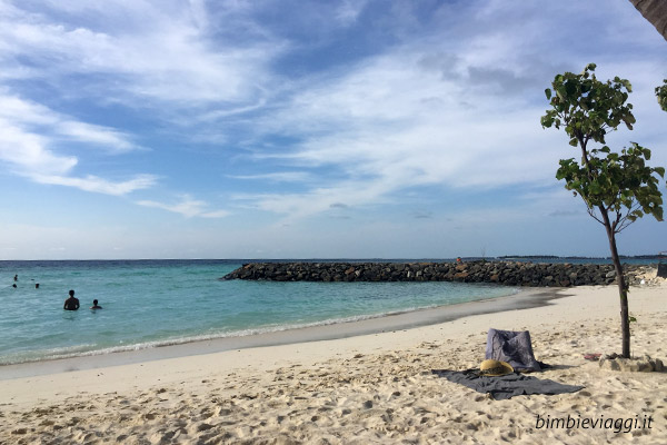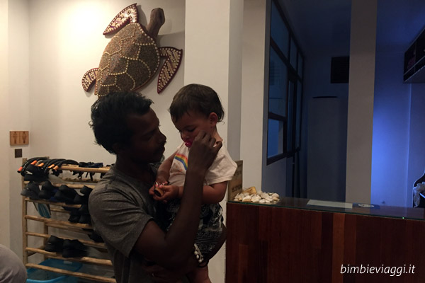 A Maafushi abbiamo scelto di dormire al Velana Beach Hotel, aperto da circa un anno e davvero una delle migliori sistemazioni dell’isola. Il servizio e il personale sono eccezionali, le stanze vengono pulite a fondo ogni giorno e sono molto comode e ben arredate. La cucina è ottima e hanno seggiolone e kids menu. Il manager e il suo staff si sono presi cura della piccola per tutto il soggiorno, portandola in giro a vedere pappagalli e gattini, a prendere il gelato e a giocare sull’enorme dondolo in giardino.