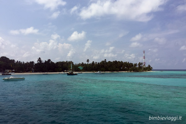La mattina dopo partiamo per l’isola di Maafushi. Scegliamo di prendere la public boat, più lenta ma più grande delle barche veloci per turisti, ci sembra più comoda per la traversata con la bambina.