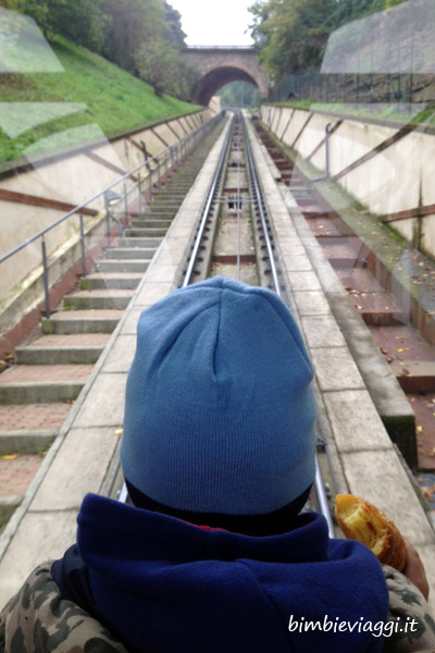 La corsa in funicolare è stata veramente piacevole e Chicco è rimasto attaccato al vetro a godersi il panorama e lo scorrere dei binari.
