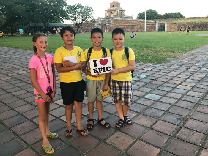Nel tardo pomeriggio ci rechiamo alla spianata di fronte alla Cittadella e subito veniamo presi di mira da un gruppetto di simpatici bambini in maglietta gialla: sono accompagnati dalle loro insegnanti di inglese e ci spiegano che hanno bisogno di intervistare i turisti per un progetto scolastico. Mia figlia più grande si offre volontaria, il progetto prevede che loro pratichino l’inglese facendole delle domande, alla fine concludiamo con grandi sorrisi e foto di gruppo… chissà se ora saremo esposti su qualche parete di qualche scuola vietnamita! 😊