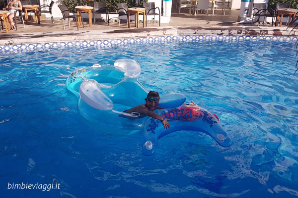 L’hotel possiede una piscina, cosa per cui il mio seienne ha un debole ed eccolo accontentato! Rientrato dalla spiaggia non si è mai fatto mancare un tuffo prima di cena. Il servizio di mezza pensione offre un buffet a prezzo molto accettabile con buone opinioni circa la qualità su Tripadvisor che mi sento di condividere.