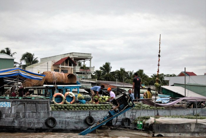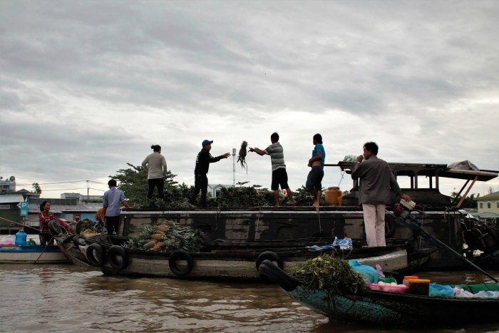 La guida ci spiega che su ogni barca vive una famiglia con i loro animali, restano qui fino a quando tutta la merce non viene venduta, in genere 3-4 giorni, dopo risalgono di nuovo il fiume per acquistare nuova merce dai contadini. Tutto viene spostato a mano quindi si possono vedere uomini che ad esempio si passano le angurie lanciandosele da una barca all’altra.