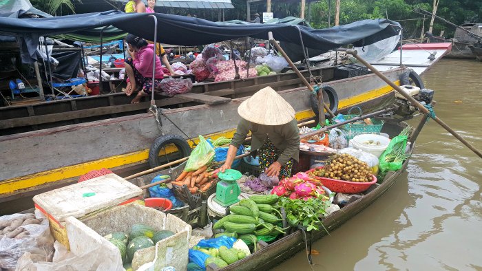 La navigazione sulla nostra barchetta è un po’ lenta ma siamo molto contenti di essere arrivati fino a qui. Phong Dien è un mercato raccolto e autentico, niente a che vedere con il floating market che avevamo visitato qualche anno fa a Bangkok, qui non si trovano souvenir ma solo frutta, verdura, carne e pesce, donne locali che vengono per chiacchierare ed acquistare, alcune cucinano la colazione direttamente in barca.