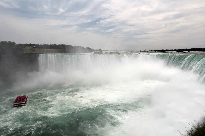 Alla fine, nonostante ci fossimo posti in modo decisamente snob verso le attrazioni turistiche della zona, dopo aver visto le barchette arrivare fino ai piedi delle cascate abbiamo capitolato e siamo saliti a bordo della Hornblower: un traghetto che porta i turisti prima sotto il versante americano e poi sotto quello canadese. Noi ci siamo imbarcati senza fare un minuto di fila: qui tutto è attrezzato per far salire il più velocemente possibile i turisti muniti di impermeabile rosso su due barchette che fanno la spola dal molo alle cascate e ritorno. È una trappola per turisti? Sicuramente! Ma vedere le cascate dal basso è stata un’emozione enorme, oltre che una bella doccia! Trovarci al centro del semicerchio delle Niagara Falls canadesi, sovrastati da una quantità d’acqua inimmaginabile ci ha fatti sentire piccolissimi e impotenti davanti ad una natura prorompente. Certo, abbiamo condiviso queste emozioni con altre centinaia di turisti come noi, ma non per questo sono state meno intense.