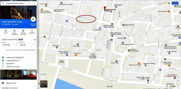 A meno di venti metri incrocia Corso Vittorio Emanuele, una zona pedonale dove c’è la classica passeggiata con tanti locali ed alcuni monumenti come il Palazzo Senatorio e la Chiesa del Collegio dei Gesuiti; proseguendo invece sempre dritto si giunge in tre minuti al porto dove ci sono i parcheggi e gli imbarchi per le Isole Egadi.
