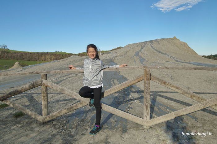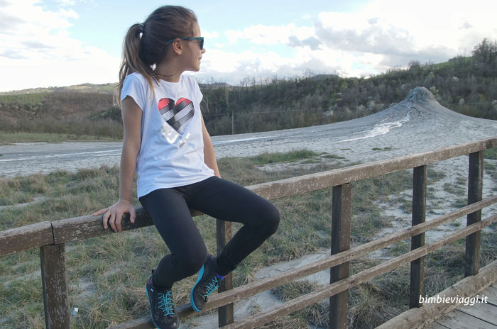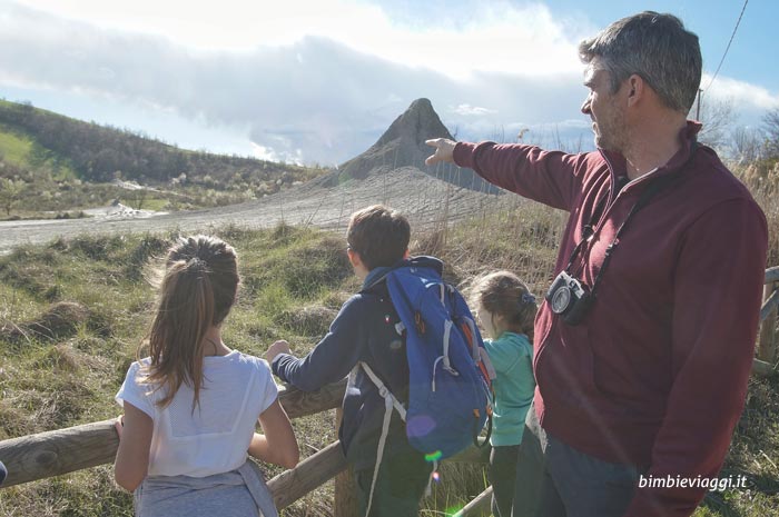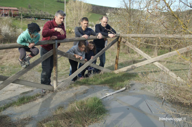 Il primo tratto che abbiamo percorso è stato il “sentiero siti aperti” che parte ai piedi della Ca’ Rossa ed è formato da una passerella di legno lunga 150 metri e accessibile anche con passeggini e carrozzine, che consente a tutti quanti di poter ammirare da poca distanza i vulcani di fango.