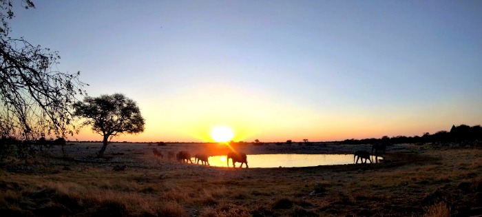 Il pomeriggio lo dedicheremo all’osservazione naturalistica seduti comodamente alla waterhole di Okaukuejo (1100 NAD due notti). E come nella migliore delle tradizioni, al tramonto, arriva un gruppo numerosissimo gli elefanti: sono una quindicina, che ci intrattiene con le sue elaborate abluzioni. La sera, all’interno del campo, gli sciacalli vanno in cerca di avanzi di cibo.