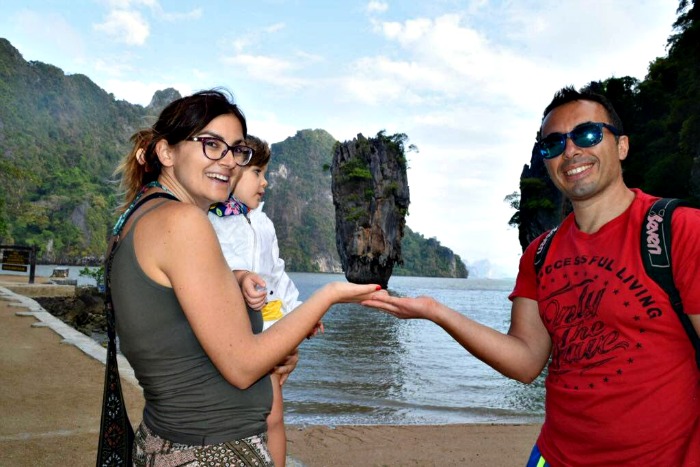 La sveglia successiva è all’alba infatti alle 4.45 la navetta ci aspetta già in hotel per portarci alla Marina per l’escursione alla baia di Phang Nga, l’isola di James Bond, che dista 45 minuti di motoscafo dalla marina. L’escursione prevede come prima tappa proprio l’isola di James Bond… sono le 7.30 e siamo i primi del giorno a mettere i piedi li, tanto che anche i vari chioschi turistici sono ancora chiusi. Questo ci consente di fare le foto con calma, rispettare i tempi di Alisia e di goderci l’isola. La tappa successiva è il kayak tra le mangrovie, molto divertente e suggestivo: il kayak può portare due persone ma essendo Alisia piccola ci consentono di stare tutti e tre insieme, lei incuriosita da tutto è rimasta seduta tutto il tempo.