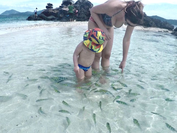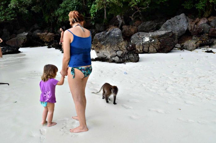 Le isole distano 20 minuti di motoscafo dalla marina e il tour è così strutturato: facciamo una sosta snorkelling alla prima isola che non ha spiaggia e subito dopo 2 soste in due isole diverse di più di 2 ore ciascuna: spiagge di sabbia bianca con pezzi di coralli a terra e acqua cristallina in cui è possibile nuotare con i pesci anche in acqua molto bassa. Alisia è euforica potendo giocare con tutti i pesci che le nuotano intorno. In queste spiagge è possibile noleggiare delle sdraio al costo di 100bath (2,5€) per potersi rilassare sulle palafitte all’ombra. Il pranzo offerto dal tour operator è veramente dignitoso (riso, pollo e patate fritte) e in ogni sosta ci viene offerta frutta fresca e acqua a volontà.