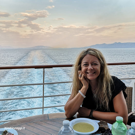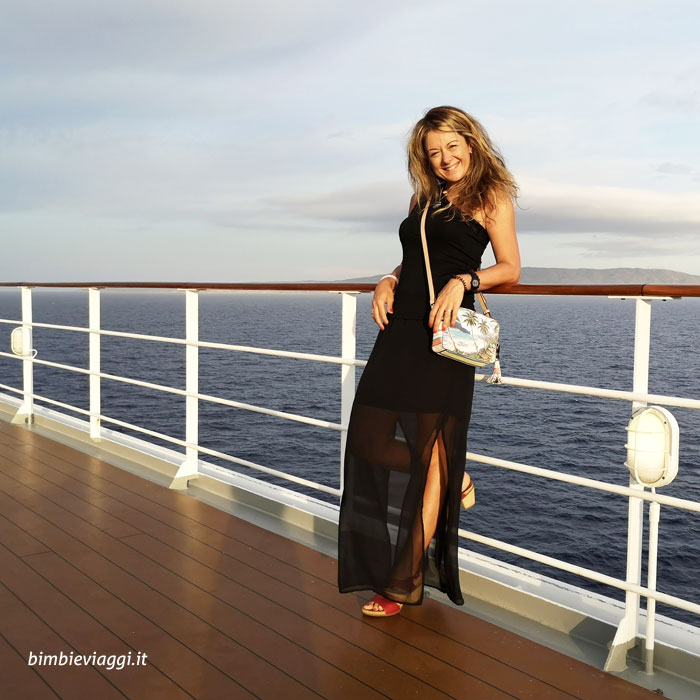 Noi l’abbiamo scoperto la prima sera. Ci avevano inserito nel primo turno del ristorante, dalle 19 alle 21. Vestite e truccate di tutto punto, alle 20 ci troviamo all’ingresso del salone. Peccato che non ci avessero detto che si poteva entrare solo fino alle 19.15. Dopo un iniziale momento di smarrimento (ok, di rabbia, perché non esiste che tu non me lo dica), andiamo all’altro ristorante, self service, sul ponte più alto. Troviamo un tavolo libero all’aperto e da qui ammiriamo un tramonto da paura, con il sole che si butta in mare proprio in fondo alla scia lasciata dalla nave. Mentre gli altri se ne stavano dentro, chiusi nell’aria condizionata del ristorante, noi eravamo lì davanti a un panorama incantevole che ci avrebbe poi accompagnato in ogni serata a bordo, e in ogni pranzo fatto in navigazione. Magari il cibo era qualitativamente inferiore rispetto a quello servito al ponte 5, ma noi avevamo tutto quello che ci serviva, dal cibo alla buona compagnia, passando per un’atmosfera rilassata e per un paesaggio che valeva più di ogni altra cosa. Il risultato è che gli abiti di gala sono rimasti in valigia e noi abbiamo vissuto serate indimenticabili senza neanche accorgerci di essere in crociera.