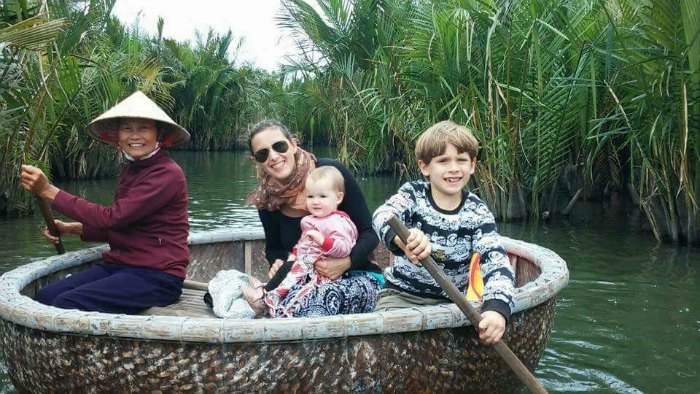 Nel pomeriggio recuperati gli zaini abbiamo preso un curioso pullman per Hoian. Si tratta di bus turistici che al posto dei normali sedili hanno tre file di lettini a castello molto stretti . Fortunatamente in fondo tre letti erano uniti ed andavano a formare un letto unico di circa una piazza e mezza dove però potevi stare solo sdraiato, sicuramente sconsigliato per chi soffre di claustrofobia, ma almeno siamo riusciti a starci tutti anche perché avevamo solo tre posti (i due piccoli non pagavano) e se avessimo avuto i posti normali sarebbe stato un disastro. Dopo circa 4 ore di viaggio nelle quali i bambini si sono rivelati dei veri e propri viaggiatori on the road siamo arrivati a Hoian. Accolti da una popolazione fantastica, ci siamo fermati a mangiare qualcosa in un locale. Tutte le persone presenti si sono adoperate per aiutarci a trovare un posto per dormire e ci hanno personalmente accompagnati portandoci gli zaini con i motorini all’hotel. Abbiamo fatto una bellissima uscita sulle coconut boat, delle mini imbarcazioni rotonde fatte di bambù.