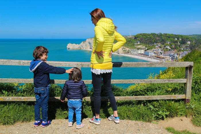 Sebbene la passeggiata sia facile non mancano i saliscendi e alcuni sono abbastanza ripidi, perciò vi consiglio un robusto passeggino a 3 ruote o in alternativa fascia/marsupio per i bimbi più piccoli. Bianca durate la passeggiata postprandiale ha dormito comodamente nel passeggino, mentre Lorenzo saltellava tra i prati e i pascoli alle spalle delle falesie. Le falesie non sono cintate, non esistono parapetti (se non vicino ai ponti che le collegano), la passeggiata è direttamente a strapiombo sul mare, quindi attenzione alla sicurezza di tutti. Durante la passeggiata non è mancato il vento, una costante da queste parti, quindi meglio avere a portata di mano una felpa o un pile a seconda della stagione in cui vi recate a Ėtretat.