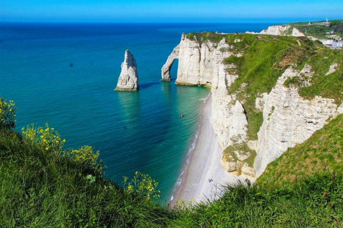 Ėtretat, che si affaccia direttamente sullo stretto della Manica, è uno dei luoghi più fotografati della Normandia, in tante brochure avrete sicuramente visto le sue alte scogliere bianche in alabastro che assumono forme spettacolari, come archi, fiordi accessibili solo dal mare e gallerie.