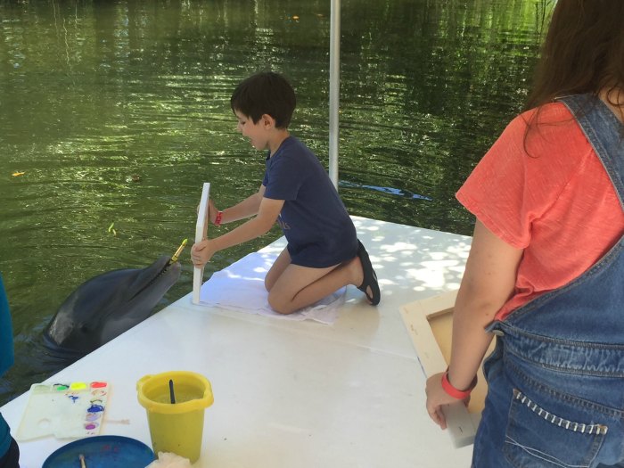 In seguito l’istruttrice ci spiega come si svolgerà l’attività e ci presenta Skypper, il nostro delfino pittore. Ci spiega che il rapporto con questo mammifero è bellissimo, intenso e quanto siano intelligenti questi animali, quanto siano altruisti e generosi. Si percepisce amore e passione dalle sue parole, ed è una cosa bellissima. Skypper ci da il benvenuto con uno spruzzo e avvicinandosi velocemente al bordo della banchina dove Alessandro viene posizionato. Sceglie 3 colori e la tavolozza viene appoggiata di fianco a lui. Il delfino, preso possesso del pennello, inizia a intingerlo e a disegnare sulla tela. E’ un momento magico, Ale è estasiato. Skypper continua fino a che non ha concluso il suo capolavoro. E’ incredibile, siamo tutti concordi nel riconoscere nel disegno una tartaruga che nuota. E’ il momento del ringraziamento e dei saluti e Skypper riemerge per farsi dare un bacio da Alessandro.