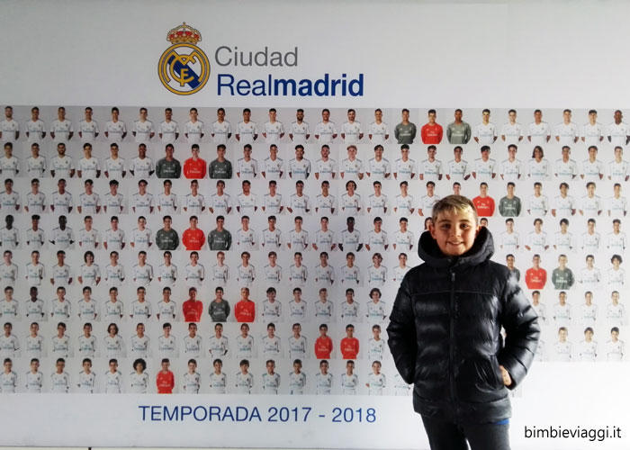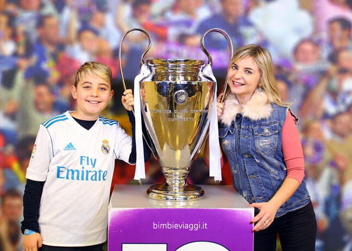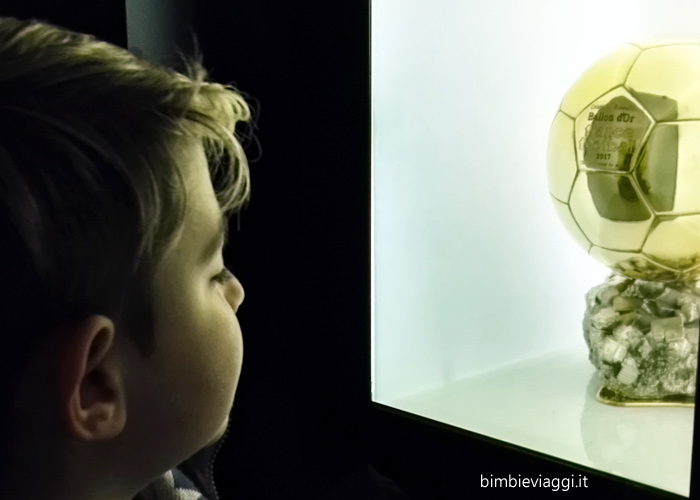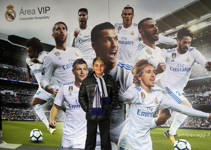 La visita viene fatta in completa autonomia seguendo un percorso obbligato. Si inizia dalla grandiosa vista dello stadio dall’alto, per passare poi all’interno del museo. Questo è particolarmente interessante in quanto alterna cimeli storici (maglie, palloni da calcio, trofei e gagliardetti) a contenuti tecnologici e interattivi (filmati, touch screen, contenuti audio, …). Il tutto è studiato nei minimi dettagli e chiunque sia un minimo appassionato di calcio non può che emozionarsi davanti ai goal di personaggi come Alfredo Di Stefano, Ronaldo Nazario, Raoul, Zidane e CR7. Se poi si è “madridisti” come il mio Lorenzo, ci si può trovare a cantare a squarciagola l’inno della squadra 😉 . Un’intera sala è poi dedicata al team attuale, con riproduzioni digitali dei giocatori in azione con tutti i dati e le caratteristiche tecniche (peso, altezza, età, ruolo, statistiche ecc). I trofei più recenti sono poi esposti a parte, in teche ancora una volta digitali: dalle 12 Champions League vinte (l’ultima a Giugno 2017 a Cardiff contro la Juventus) ai palloni d’oro di Cristiano Ronaldo, Ronaldo Nazario, Cannavaro ecc.