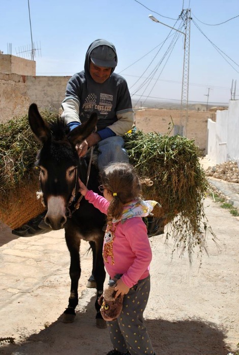 Girovagando per le viuzze di Tamezret, fra le piccole porte azzurre e verdi, incontriamo persone anziane che ci ringraziano per la visita al loro paese e un signore in sella ad un ciuchino che si ferma per farlo accarezzare ad Emma.