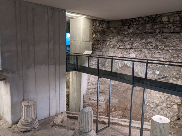 Qui si può camminare sopra passerelle create per ammirare i resti di un antico tempio romano-imperiale, una casa romana (rinvenuta nel 1990 durante i lavori di ristrutturazione della chiesa) con il suo pozzo, una strada romana in ottimo stato e addirittura un “water romano” collegato alla rete fognaria.