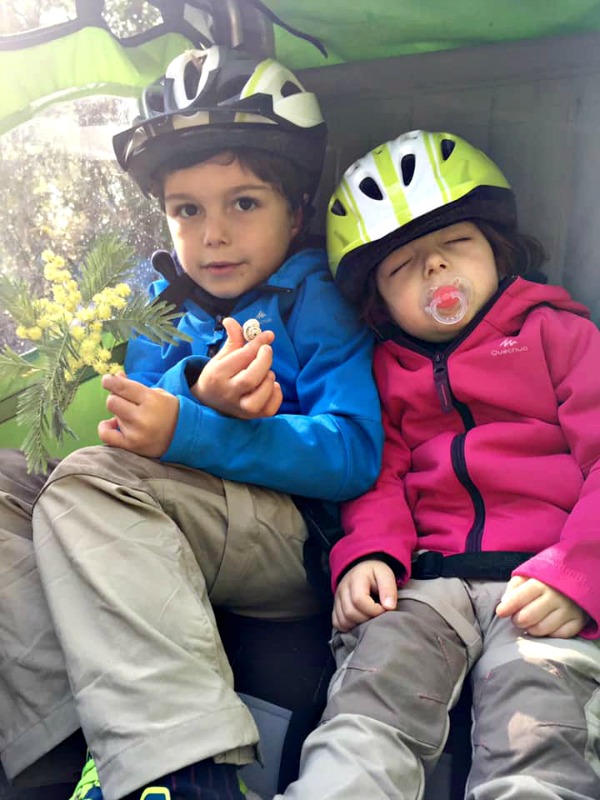 Abbiamo deciso di affittare due biciclette e un “carrellino” invece che due seggiolini (o una terza bici per il cinquenne) per permettere a Bianca, due anni, di fare tranquillamente il suo pisolino pomeridiano mentre noi pedalavamo e per evitare che Lorenzo si stancasse troppo, infatti in certe giornate abbiamo percorso circa 30 km di piste ciclabili nel silenzio assoluto avvolti dal profumo delle mimose in fiore.