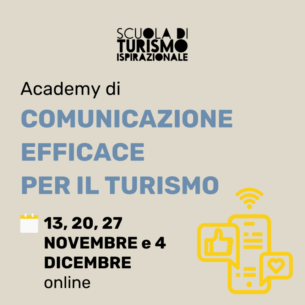 Il 2024 si conclude con un bel progetto professionale: in collaborazione con la Scuola di Turismo Ispirazionale, abbiamo organizzato una Academy Online dedicata alla “Comunicazione Efficace per il Turismo” e durante il mese di novembre si terrà la prima edizione online: 4 appuntamenti per trovare insieme le strategie per una comunicazione autentica, unica e sostenibile, lontana dalle logiche mainstream, più incentrata sulle persone.