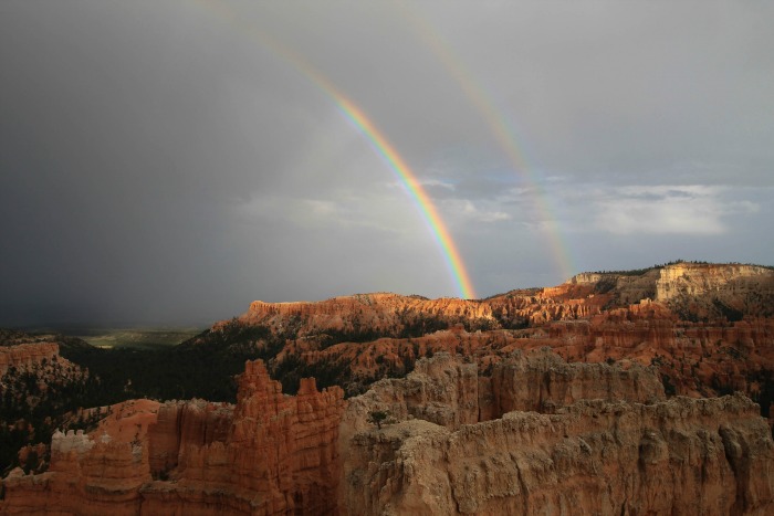 Il Bryce Canyon è uno dei Parchi più piccoli degli States, ma offre dei panorami straordinari. Dato che tutti i punti panoramici si trovano sul lato sinistro della strada guidando verso Rainbow Point, ci dirigiamo direttamente verso il punto più a Sud, per poi effettuare le soste fotografiche durante il rientro al Visitor Center. In questo modo, ogni sosta è una semplice e sicura svolta a destra al momento di reimmettersi sulla strada del parco. Durante la visita incontriamo tutti i climi possibili: sole, vento, diluvio e infine uno splendido arcobaleno che sembra sorgere dagli Hoodoo, i caratteristici pinnacoli del Parco.