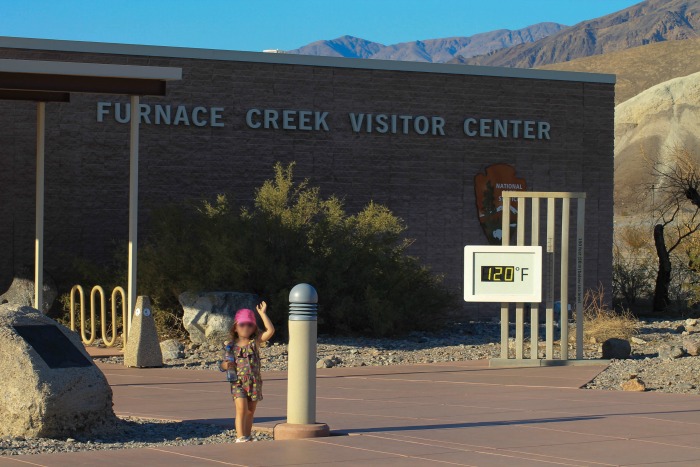 Arriviamo a Furnace Creek, il centro visitatori della Death Valley, intorno alle 17.30: il termometro che c’è all’esterno del complesso segna 120°F = 48°C. Vinciamo la paura del caldo e scendiamo dalla macchina, per andare a prendere la mappa al centro visitatori (che chiude alle 17, ma per fortuna lasciano delle cartine disponibili all’esterno).