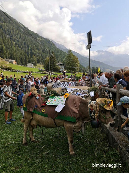 La giornata di DOMENICA, infine, è dedicata all’evento culminante della Festa dell’Alpeggio: la sfilata lungo le stradine del paese delle mucche agghindate a festa e dotate di rumorosi campanacci al collo, con la proclamazione della più bella.